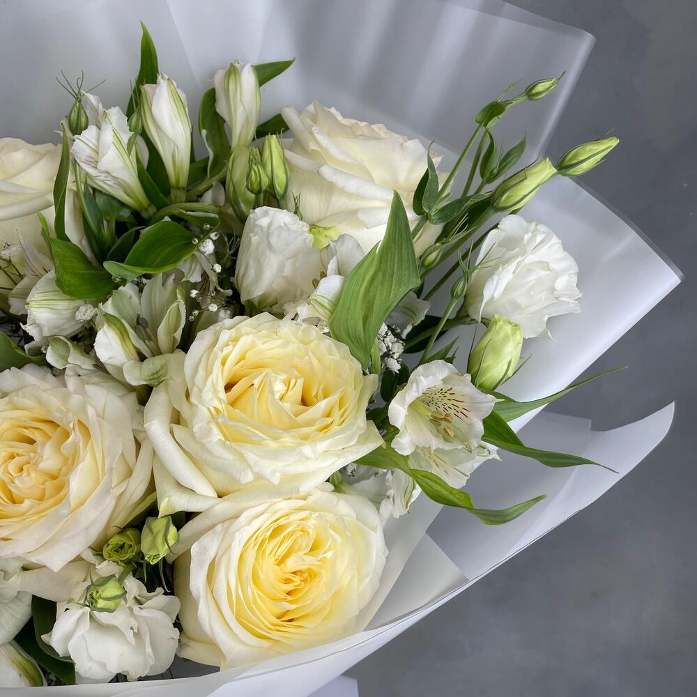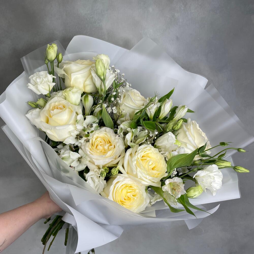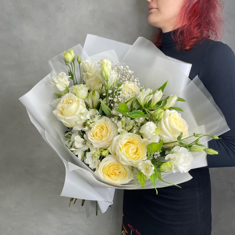 Букет из хризантемы и пионовидной розы «Марсель»(Роза кустовая пионовидная кения, хризантема Антонов, альстромерия)