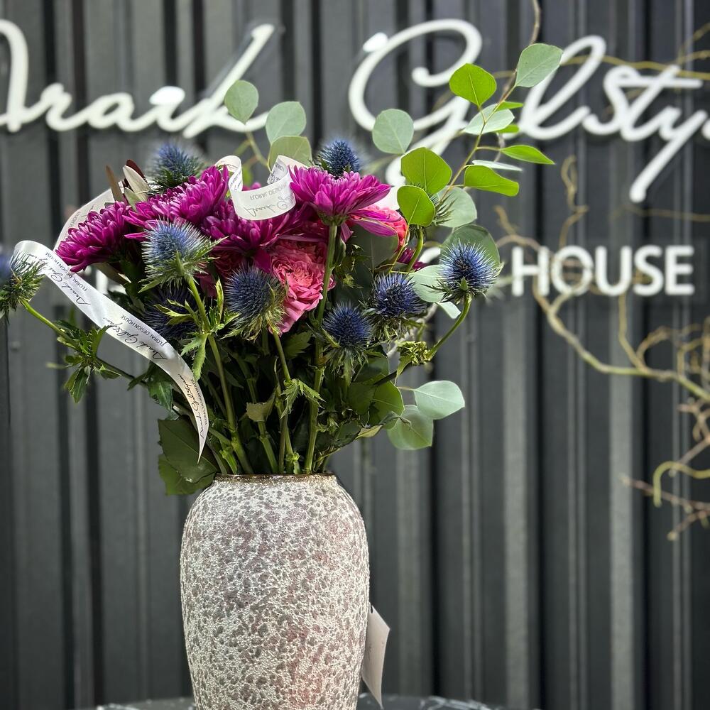 В этом букете эрингиум добавляет нежное синее сияние, напоминающее ясное небо, в то время как хризантема вносит яркость и радость, словно золотые лучи солнца. А роза, своей изысканной красотой и нежностью, придает букету шарм и романтику, словно нежное прикосновение ветра. Все вместе они создают великолепное сочетание форм и оттенков, наполняя окружающее пространство чувственным ароматом и неповторимой красотой.