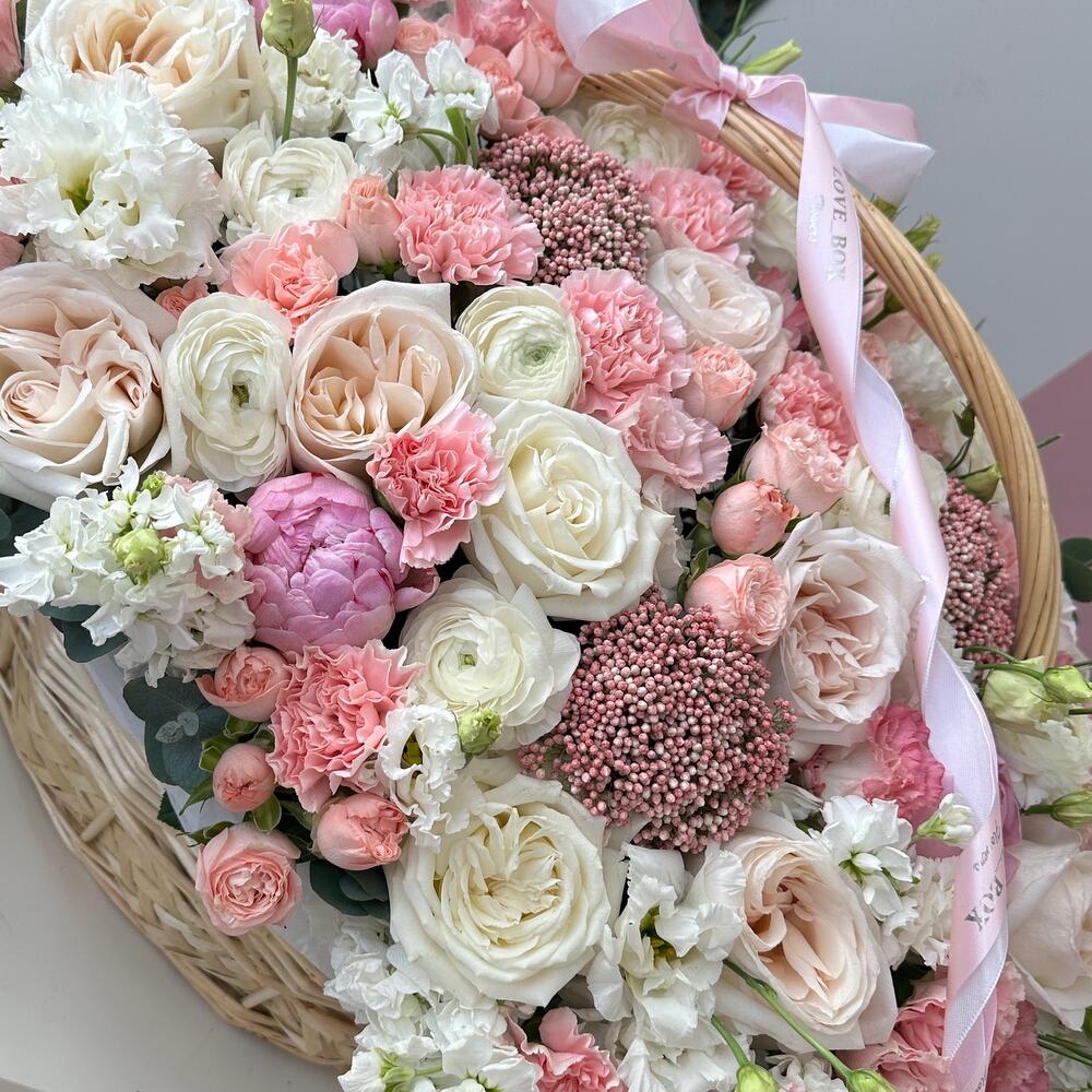 Пионовидная роза – 15 шт.Пион – 2 шт.Ранункулюс – 5 шт.Озотамнус – 3 шт.Маттиола – 9 шт.Кустовая роза – 5 шт.Диантус – 15 шт.Лизиантус – 9 шт.Корзина плетеная – 1 шт.Эвкалипт – 10 шт.