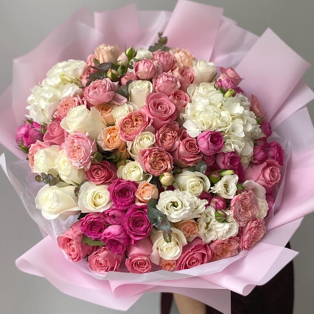 Нежный микс роз с эвкалиптом
