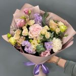 Наше Новолуние – это акварельный букет собранный с розами, гвоздикой, маттиолой и лизиантусом и оформленный в приятную упаковку. Мы также подобрали по цвету ленты.По вашему желанию мы добавим к букету открытку с самыми тёплыми словами.Букет будет бережно упакован в прозрачную плёнку от непогоды. Рекомендации по уходу:Перед тем, как поставить букет в воду, мы рекомендуем снять упаковку, освежить срез стеблей, чтобы устранить воздушную пробку, образовавшуюся за время доставки. Затем налить в вазу чистую прохладную воду, развести пакетик подкормки для срезанных цветов и поставить букет.Выбирая место для вазы с цветами, рекомендуем избегать прямых солнечных лучей, отопительных приборов и сквозняков.Замена воды и подрезка стеблей не реже 1 раза в 2-3 дня.Замечательным дополнением к букету может стать мягкая игрушка, набор свечей или стильная ваза.Желаем вам приятных покупок!
