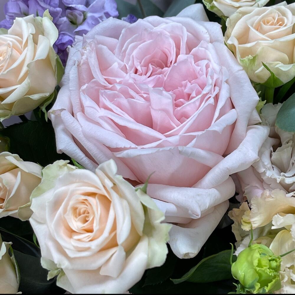 Лизиантус – 4 шт.Маттиола – 3 шт.Роза кустовая – 2 шт.Эвкалипт – 1 шт.Роза одноголовая – 1 шт.Гвоздика – 1 шт.