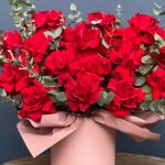 Эвкалипт – 5 шт. Роза Эквадор – 17 шт. Коробка шляпная – 1 шт. Оазис флористический – 1 шт.