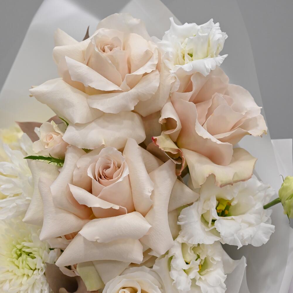 Роскошный пастельный букет в бело кремовой цветовой гамме. В составе французские розы, гортензия, одноголовая хризантема, кустовая роза и лизиантус.Флористы студии Цветочный Этикет собрали его из самых свежих цветов, тщательно продумав состав. Букет готов удивлять красотой … Показать ещёсвоего получателя! Станет идеальным подарком для любимой женщины, дочке или мамы, на День Рождения, юбилей, свадьбу и другие торжественные мероприятия. С букетом вы получите конверт с открыткой, в которой мы напишем любое пожелание, инструкцию свежести и средство для продления жизни срезанных цветов.