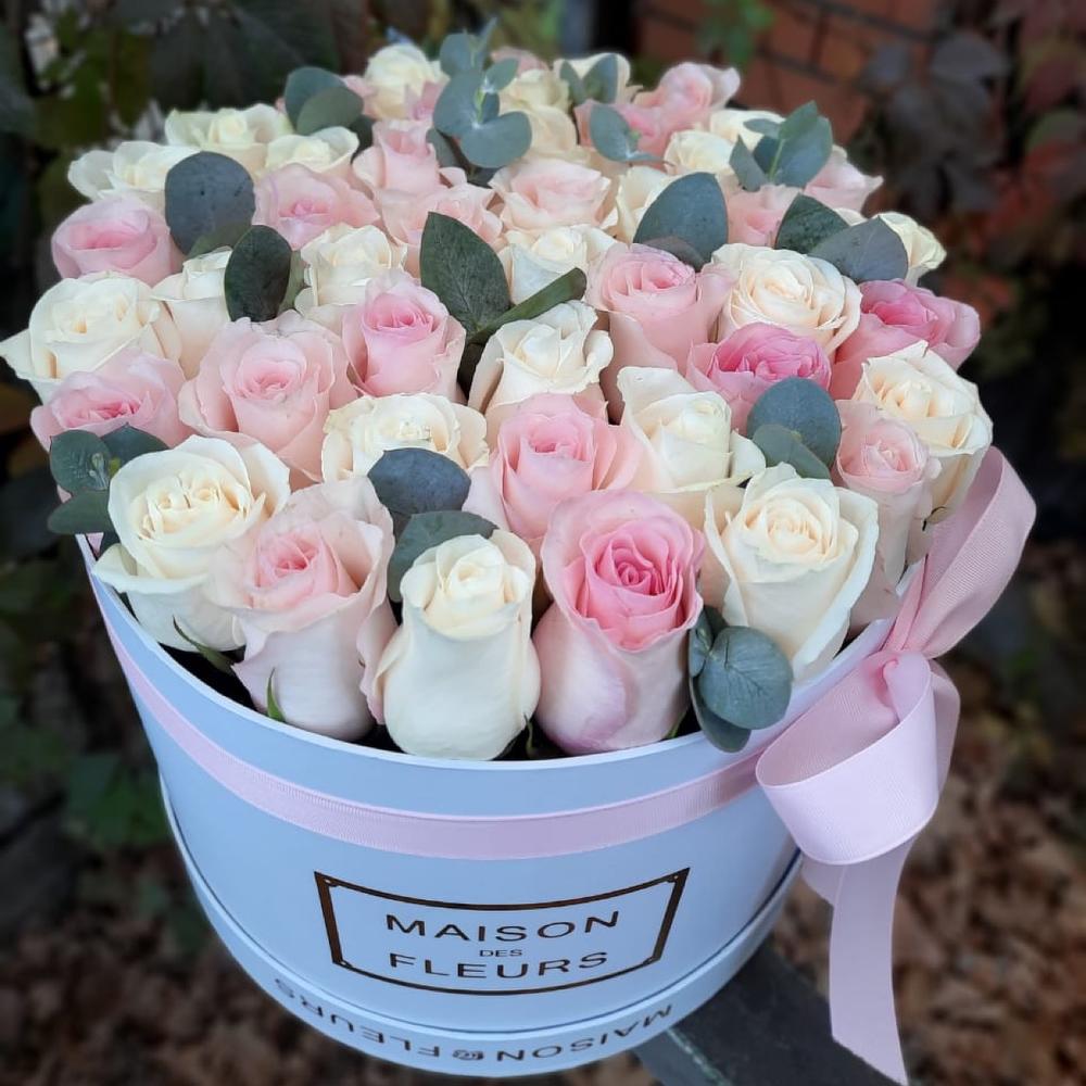Эвкалипт – 1 шт. Роза розовая – 20 шт. Роза белая – 25 шт. Коробка белая – 1 шт.