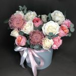 Огромная коробка с пионовидными розами и тропическими леукоспермумами. Когда хочется подарить не банальные розы