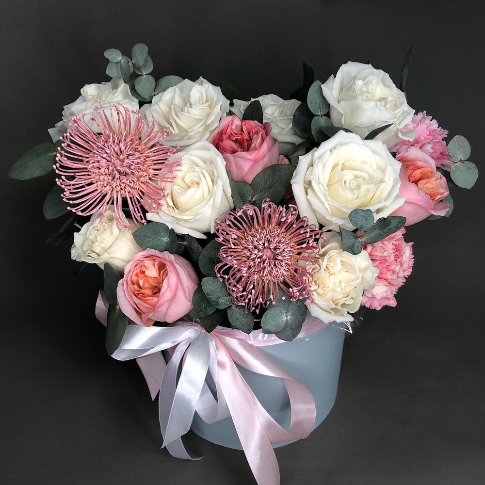 Роза пионовидная – 11 шт.Эвкалипт – 4 шт.Диантус – 3 шт.леукоспермум розовый – 2 шт.Оазис флористический – 2 шт.Коробка – 1 шт.Лента атласная – 3 шт.