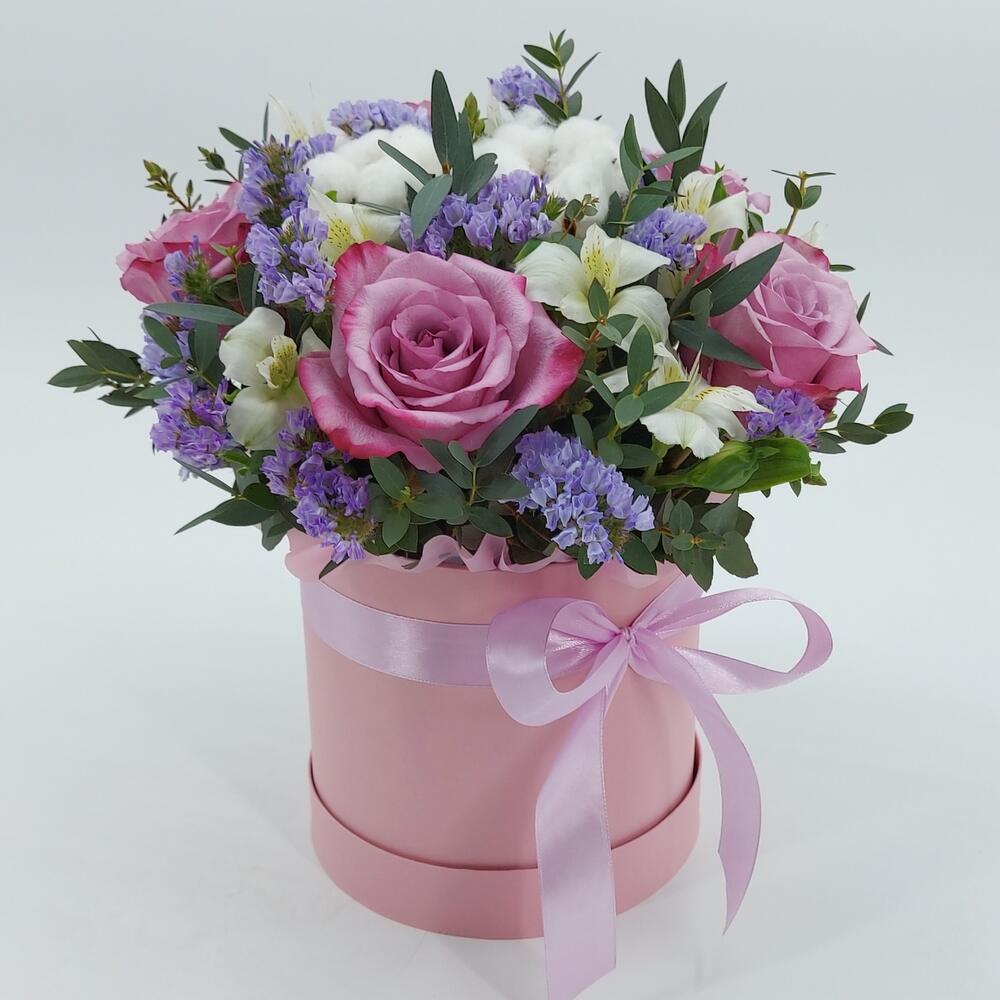 Розы, альстромерия и хлопок в коробке “Сиреневые облака”