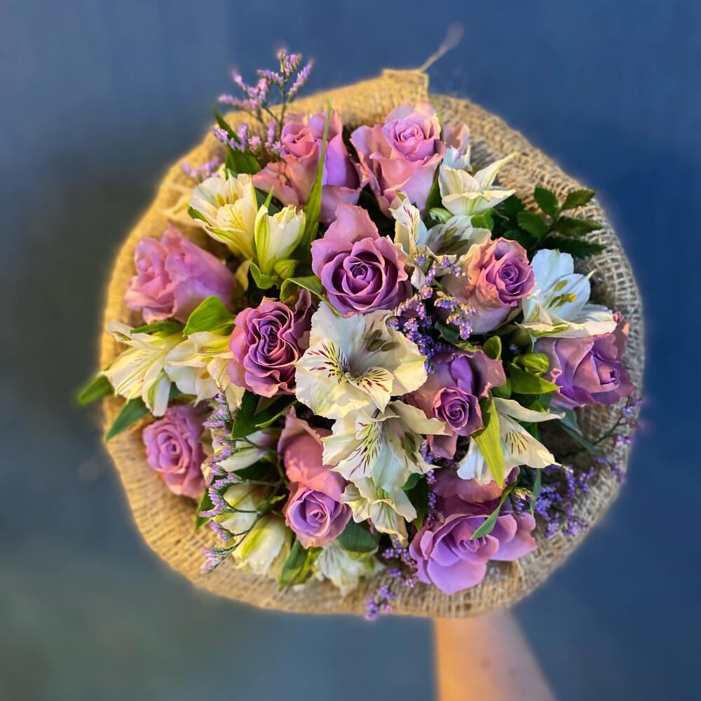 роза кения 40 см – 11 шт.Альстромерия – 4 шт.Эвкалипт Микс – 1 шт.папоротник ветка – 2 шт.Лимониум сиреневый – 1 шт.Мешковина – 1 шт.