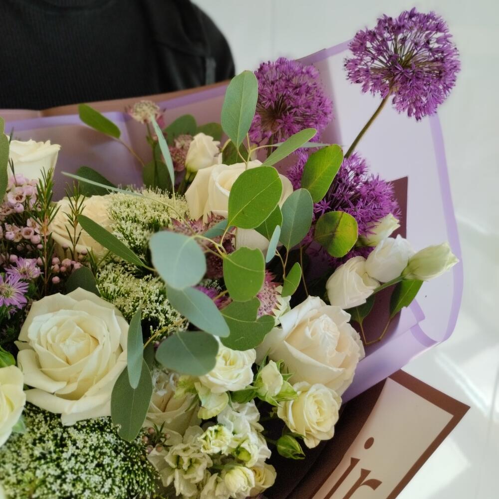 Сборный букет с розами, маттиолой, лизиантусом, эвкалиптом