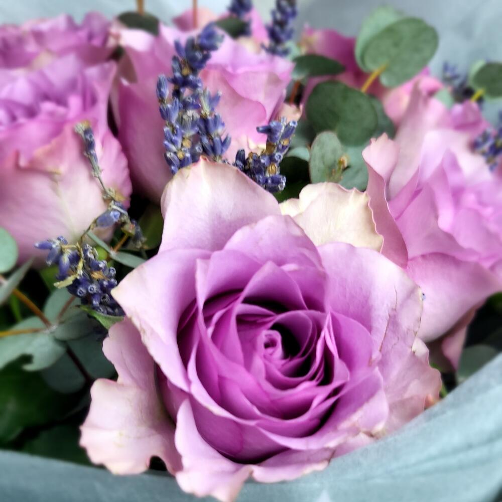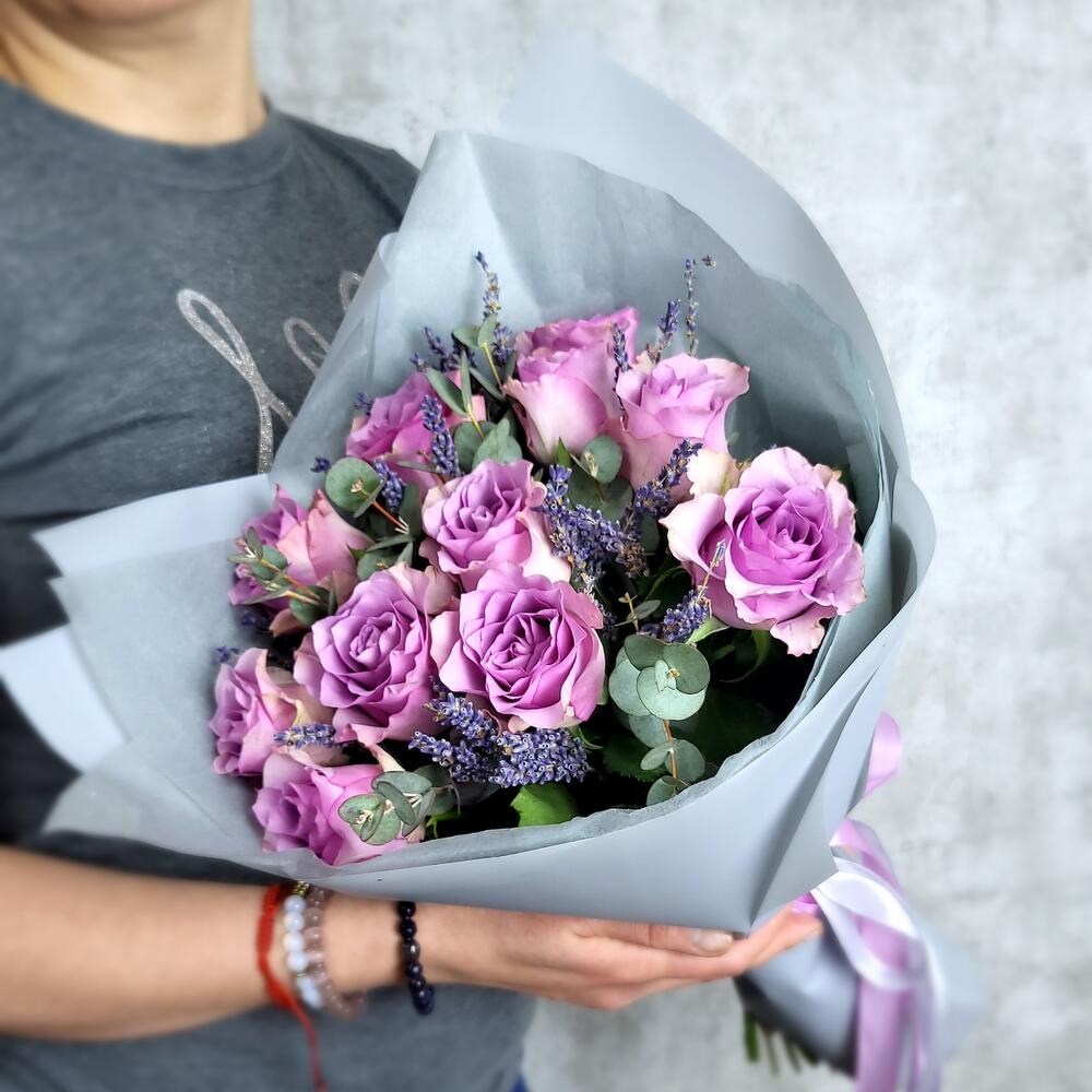 Нежный, чувственный и ароматный букет из сиреневых роз в благородной серой упаковке.