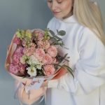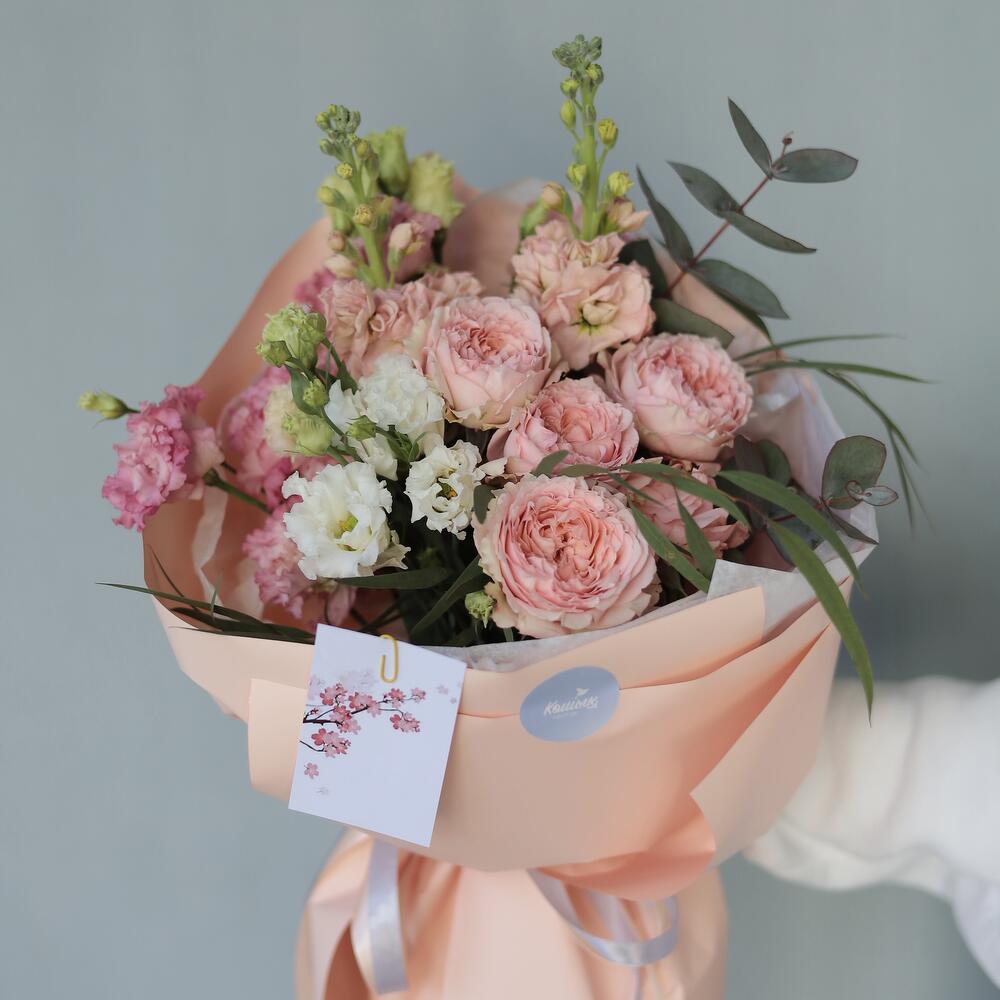Маттиола – 2 шт. Лента атласная – 2 шт. Упаковка дизайнерская – 1 шт. эустома розовая махровая – 2 шт. Эустома белая махровая – 1 шт. Карточка для подписи – 1 шт. джульетта роза пионовидная – 1 шт. зелень эвкалипта – 2 шт.