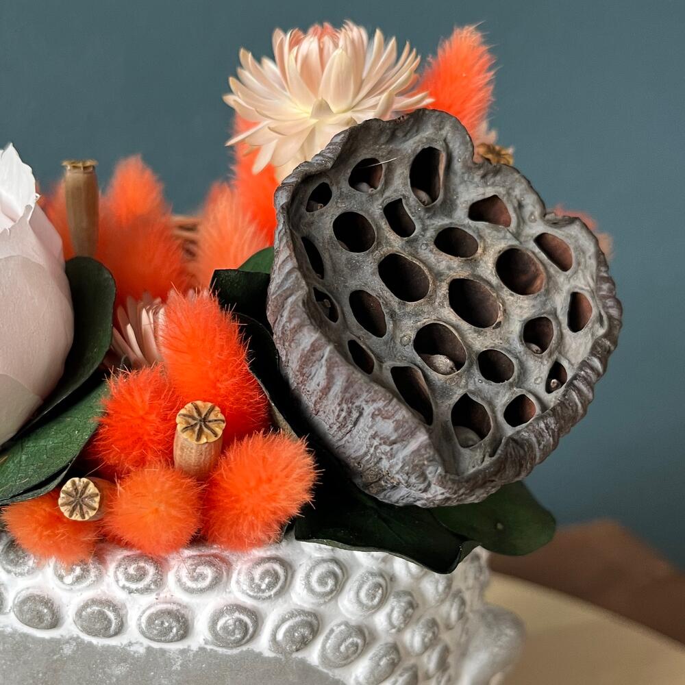 Это не просто букет цветов. А композиция, которая несет в себе философию, что наша жизнь цикличнаПионовидная роза – как распускающийся цветущий лотос А рядом с ней уже сухоцветный лотос, который уже отцвел, но в нем хранятся семена, которые в дальнейшем дадут жизнь новым цветкамЯркий оранжевый лагурус символизирует оранжевое одеяние Будды——————————————————Роза в композиции настоящая, прошедшая специальную обработку стабилизацииБукет из сухоцветов и стабилизированных цветов не завянет, а будет радовать несколько летСухоцветы не требуют трепетного ухода, ведь им не нужна вода, они не притягивают пыль, и сами не осыпаютсяК букету прилагается памятка, как сохранить внешний вид букета на несколько лет