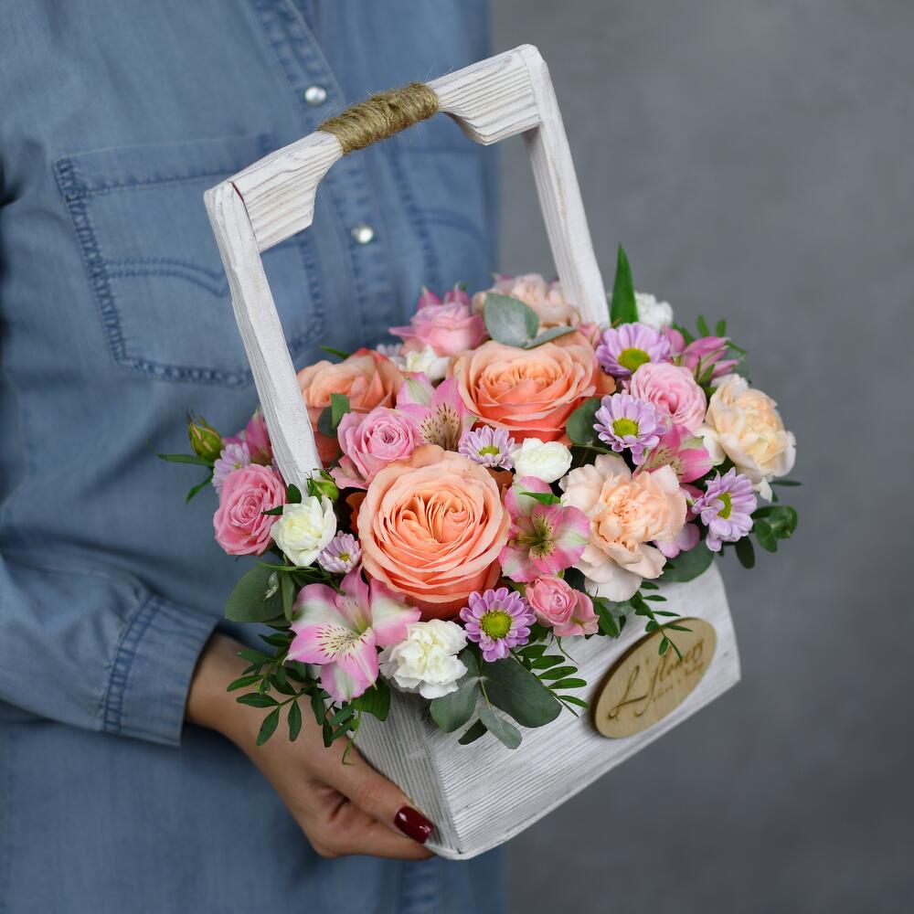 Хризантема кустовая – 2 шт.Альстромерия – 2 шт.Кустовая роза – 3 шт.Диантус кустовой – 4 шт.Диантус – 3 шт.Фисташка – 2 шт.Эвкалипт – 2 шт.Ящик деревянный – 1 шт.Роза пионовидная кахала – 3 шт.