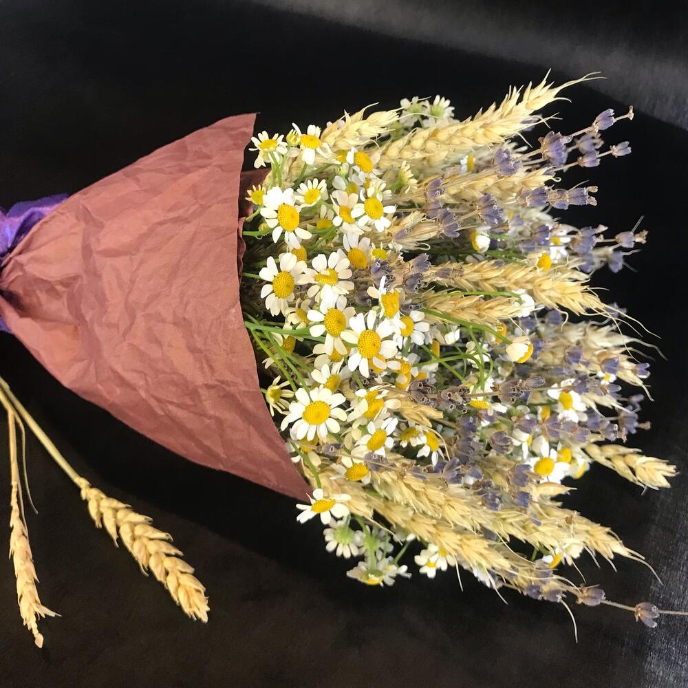 пшеница (сухоцвет) пучок – 1 шт.Лаванда (сухоцвет) пучок – 1 шт.Матрикария (Ромашка Камила) – 5 шт.Упаковка дизайнерская – 1 шт.Лента атласная – 1 шт.