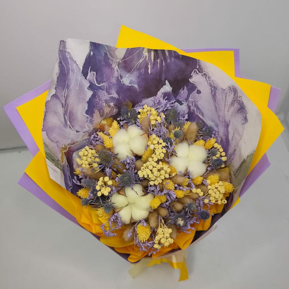 Хлопок – 3 шт.сухоцветы в ассортименте – 20 шт.Дизайнерская упаковка – 1 шт.