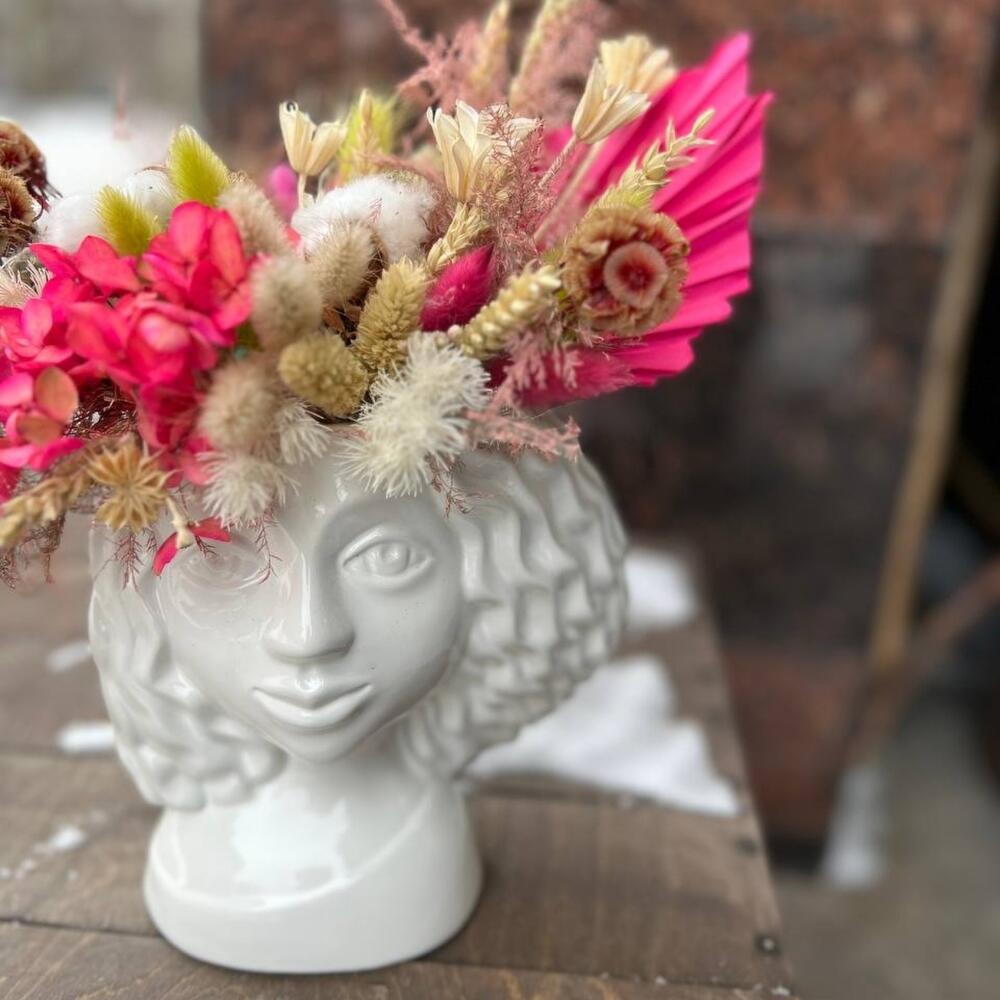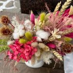 гортензия стабилизированная – 1 шт.Скабиоза – 5 шт.Хлопок – 3 шт.Лагурус (сухоцвет) – 15 шт.Пальма – 1 шт.аспарагус стабилизированный – 3 шт.Амарант – 3 шт.Нигелла – 3 шт.Колосья – 5 шт.Керамическое кашпо – 1 шт.