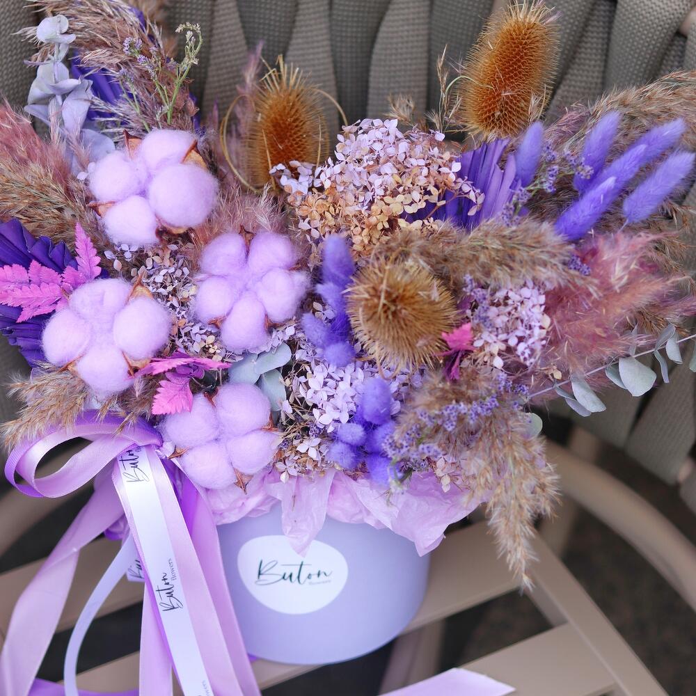 Гортензия – 3 шт.Лимониум – 1 шт.Папоротник – 1 шт.Хлопок – 4 шт.Лента атласная – 1 шт.Пальма – 3 шт.Банксия – 3 шт.Лагурус – 15 шт.Кашпо керамическое – 1 шт.Шоколадка – 1 шт.кортадерия – 3 шт.октрыточка с вашими пожеланиями – 1 шт.
