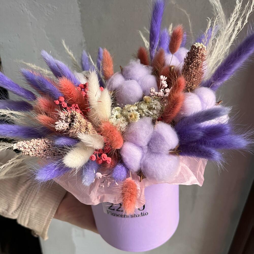 Коробка шляпная – 1 шт.Оазис флористический – 1 шт.Хлопок натуральный – 2 шт.хлопок цветной – 3 шт.лагурус белый пучок – 1 шт.лагурус сиреневый пучок – 1 шт.лагурус розовый пучок – 1 шт.ситария сухоцвет – 3 шт.сухоцвет стифа – 3 шт.Тишью розовая – 1 шт.