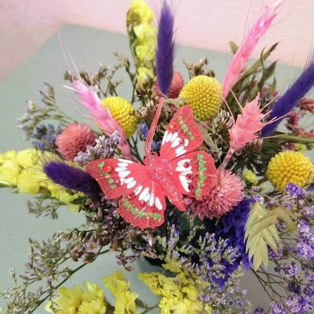 Краспедия желтая – 3 шт.Лагурус (сухоцвет) – 4 шт.Пшеница (сухоцвет) – 3 шт.Статица – 1 шт.Лимониум – 1 шт.Бабочка декоративная – 1 шт.Оазис флористический – 1 шт.Кашпо керамическое – 1 шт.