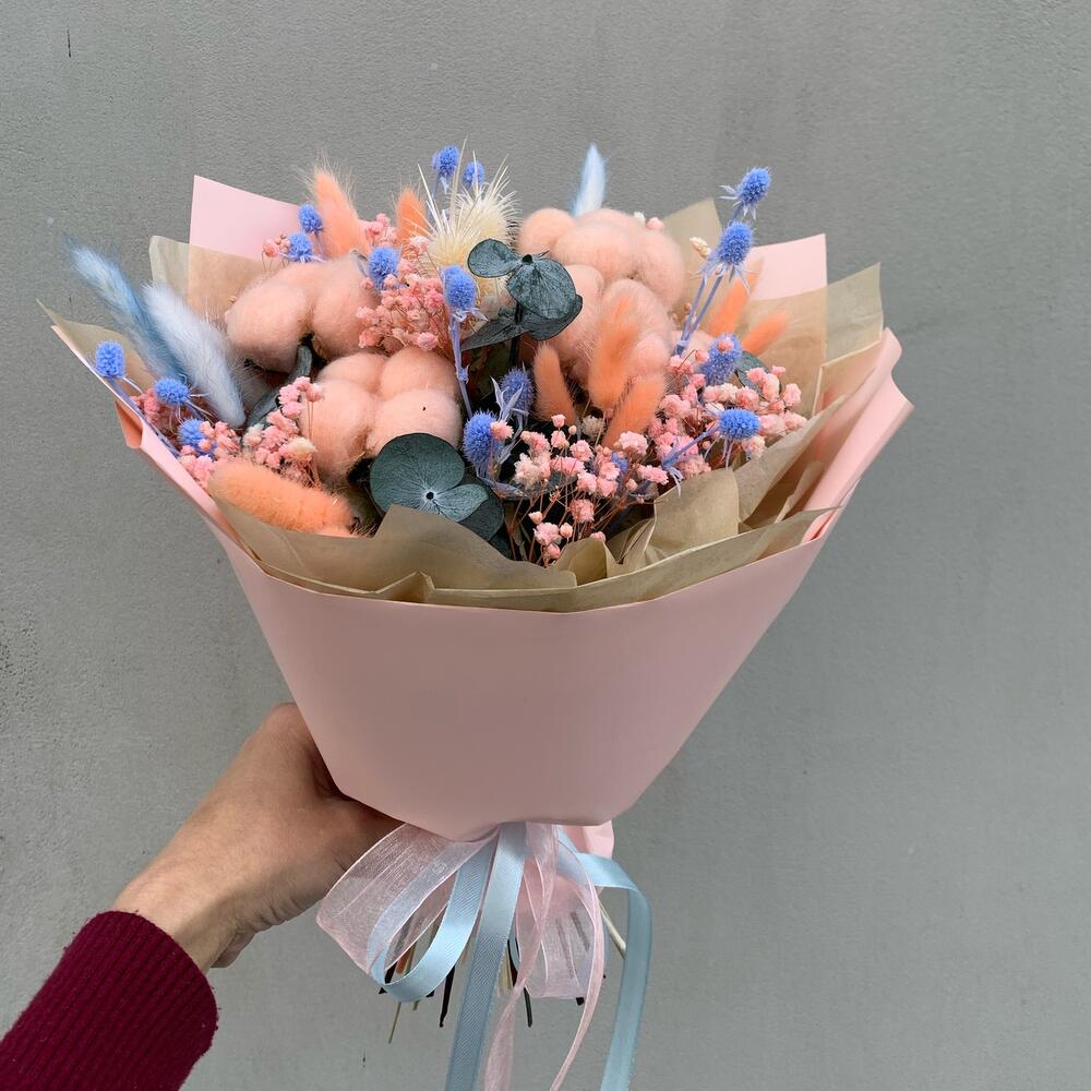 Хлопок (сухоцвет) – 5 шт.синеголовник стабилизированный – 7 шт.Эвкалипт стабилизированный – 6 шт.Гипсофила – 1 шт.Лагурус – 17 шт.эрингиум выбеленный – 2 шт.гортензия сухоцвет – 1 шт.тишью натуральная – 1 шт.Пленка матовая – 1 шт.Лента атласная – 2 шт.