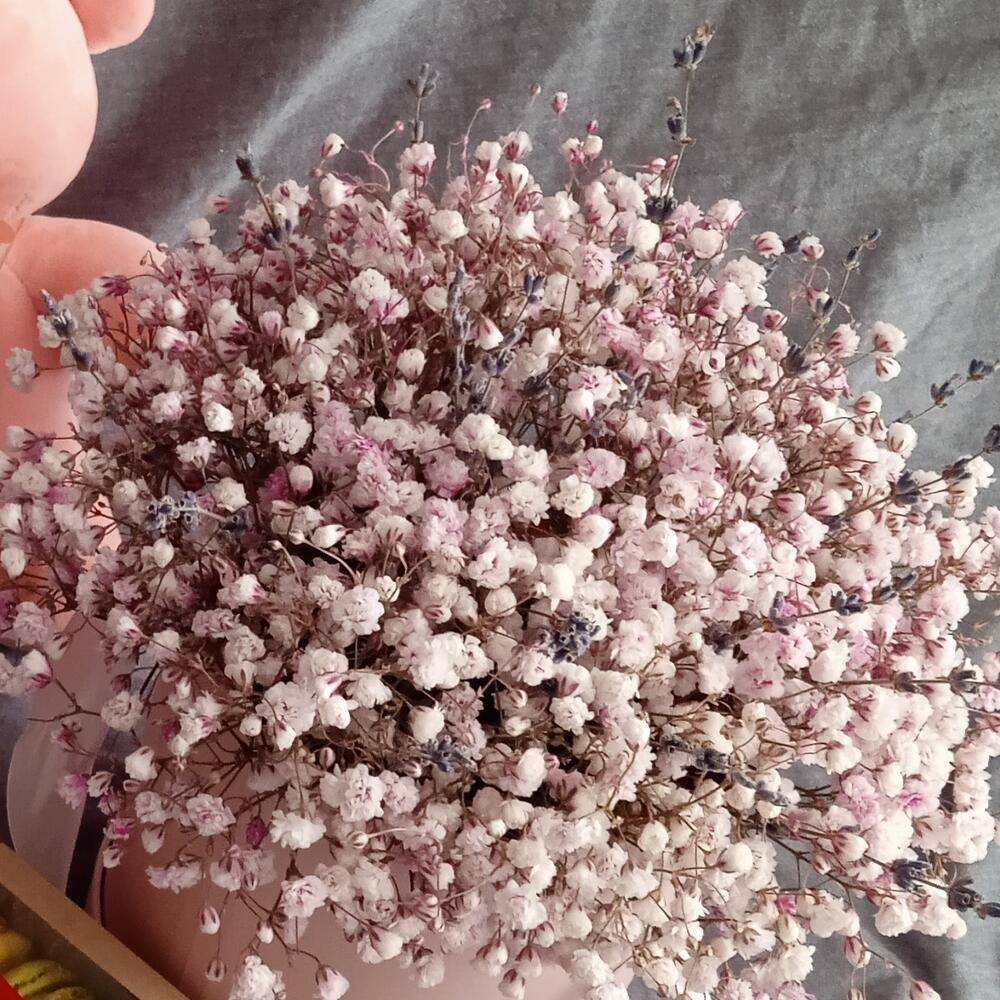 Гипсофила – 15 шт.Лаванда (сухоцвет) – 25 шт.Шляпная коробка – 1 шт.Подарочный пакет – 1 шт.макарон (пирожное) – 6 шт.мишка плюшевый 23 см – 1 шт.