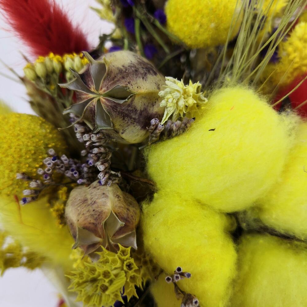 Кашпо натуральное – 1 шт.Оазис флористический – 1 шт.Краспедия желтая – 7 шт.сухоцвет желтый – 15 шт.Статица – 1 шт.Лагурус (сухоцвет) – 25 шт.Хлопок – 1 шт.Нигелла сухоцвет – 9 шт.лимониум сухоцвет – 1 шт.Пшеница (сухоцвет) – 5 шт.Папоротник – 1 шт.