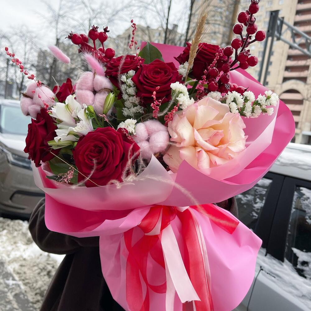 Роза красная – 6 шт.Хлопок натуральный – 3 шт.Статица – 1 шт.Салал пучок – 1 шт.Альстромерия – 1 шт.Лагурус (сухоцвет) – 3 шт.колосок полевой – 1 шт.ветка красная декоративная – 1 шт.тишью розовое – 4 шт.Пленка матовая – 6 шт.Лента атласная – 4 шт.