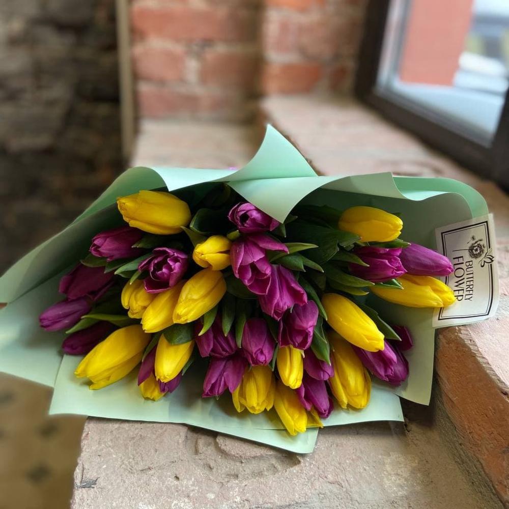 Букет из 35 желтых и фиолетовых тюльпанов “Элбург”