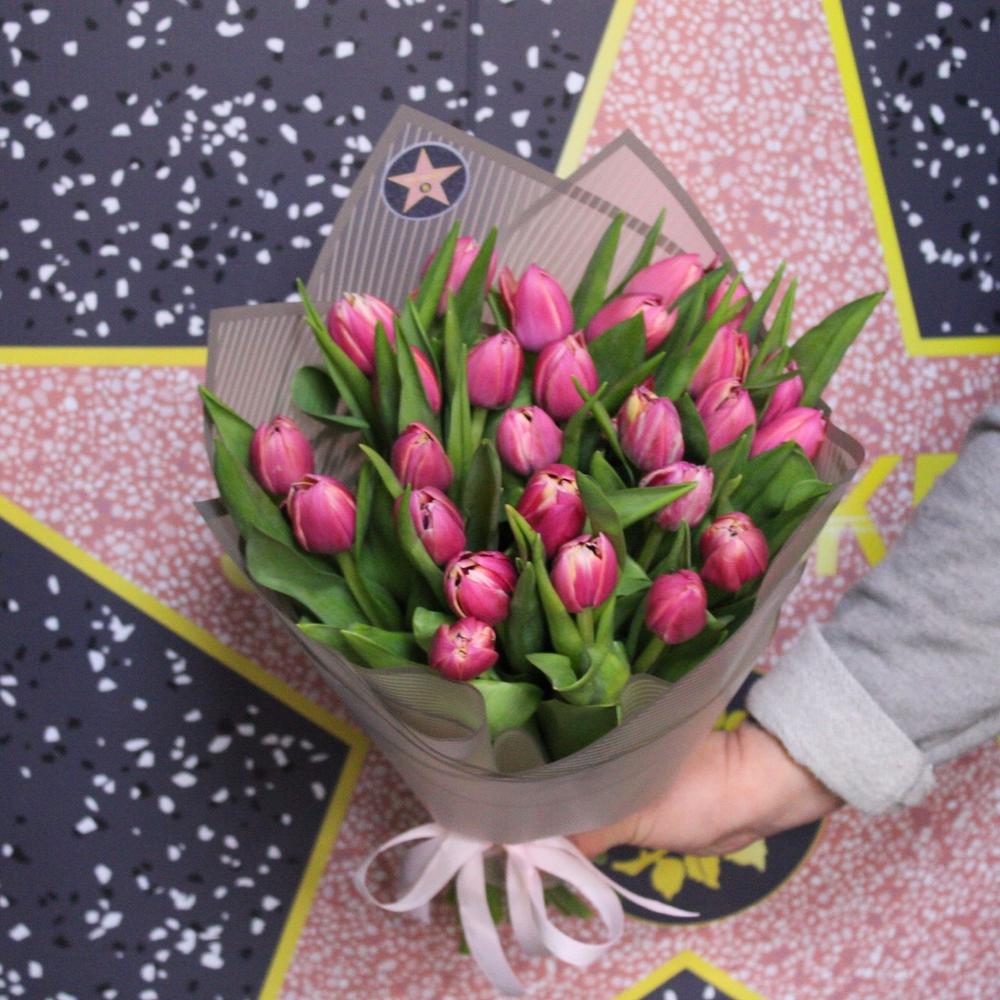 тюльпан пионовидный коламбус – 25 шт.Пленка дизайнерская – 2 шт.Лента атласная – 1 шт.