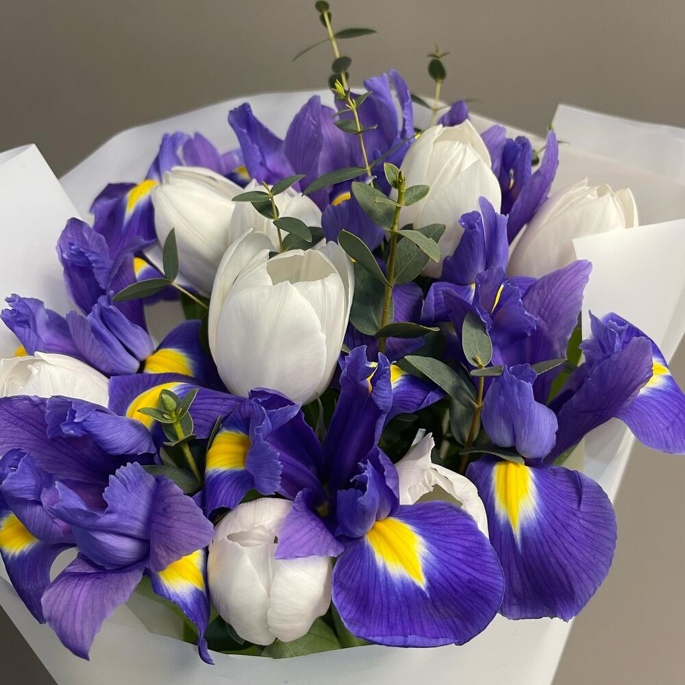 инисы синие – 13 шт.Тюльпан – 8 шт.Эвкалипт – 1 шт.впаковка дизайнерский – 1 шт.Лента атласная – 1 шт.