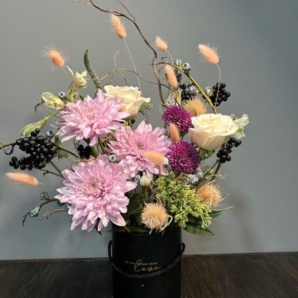 Шляпная коробка с розами, гвоздикой, гипсофилой и антуриумом “Kenzo box”