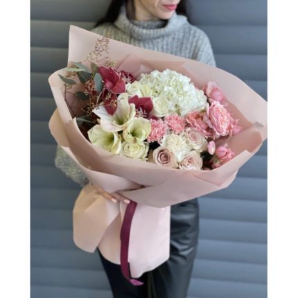 Букет из 13 розовых пионов с зеленью в дизайнерской упаковке “Принцесса Уэльская”